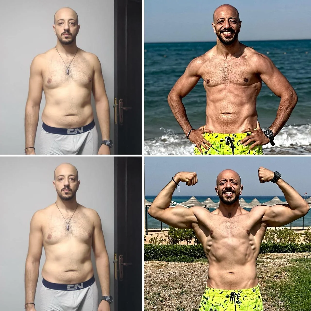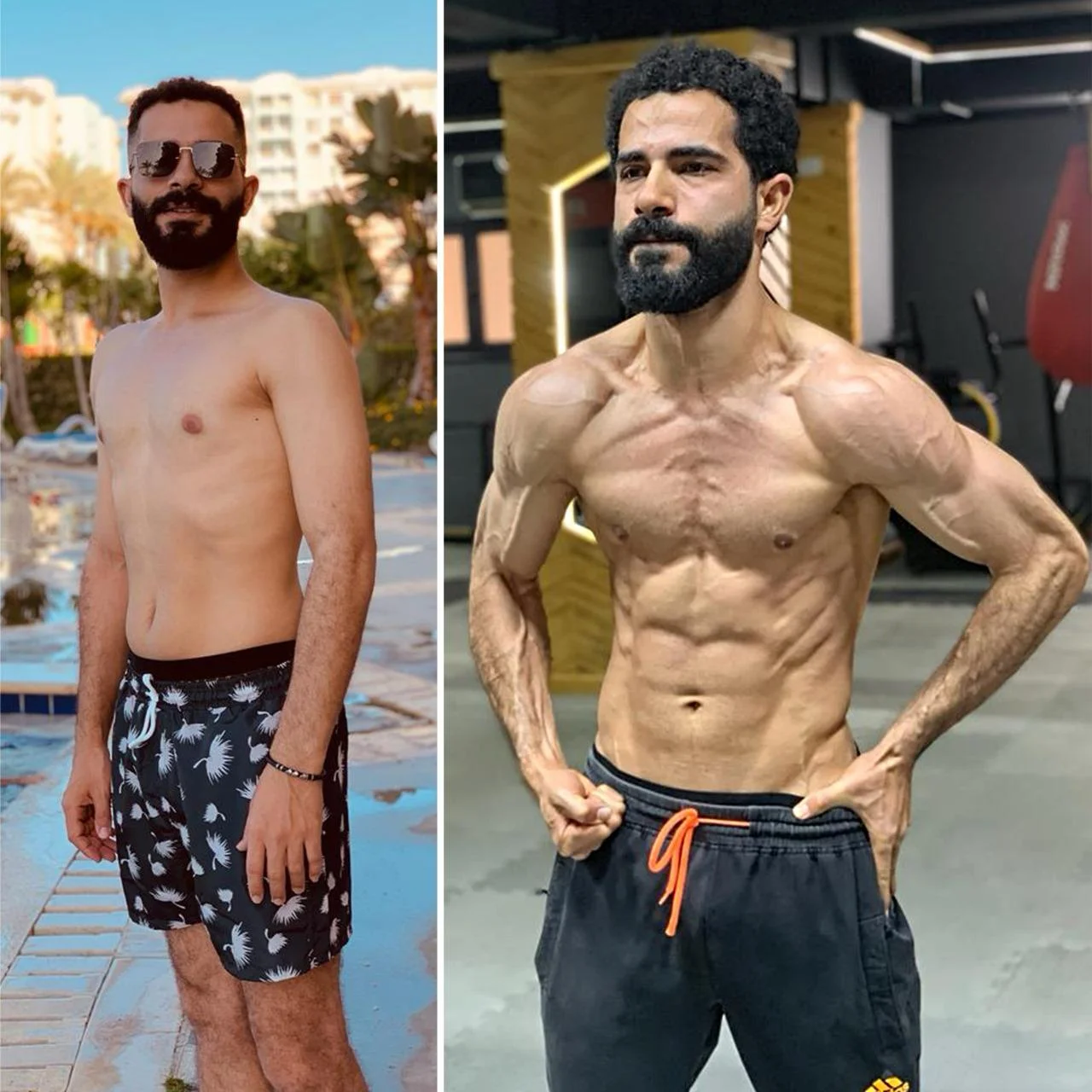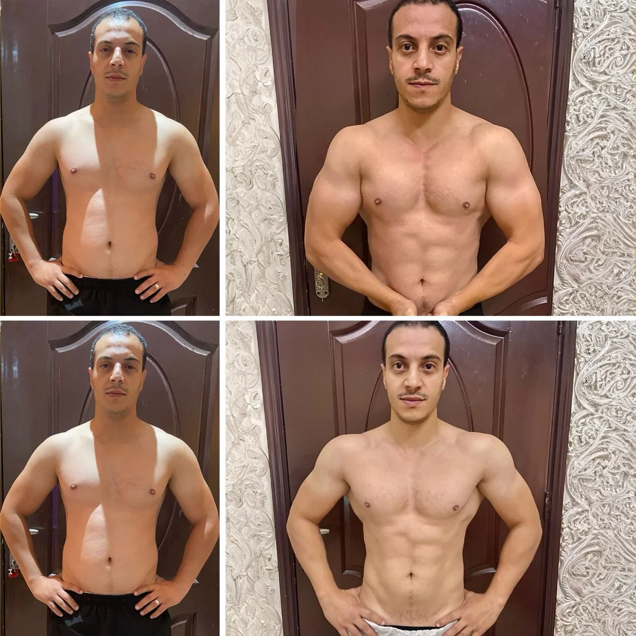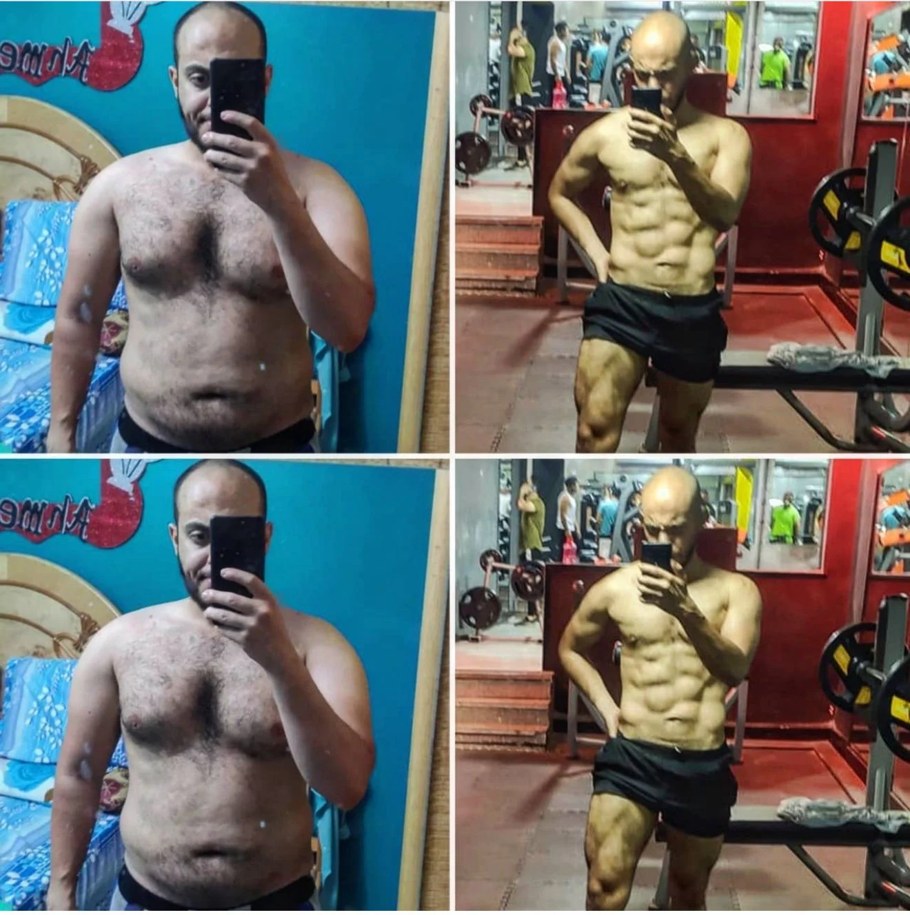 "استاذ احمد 32 سنة حلمة من زمان يوصل لجسم رياضي قوي وكان فاكر خلاص الوقت فات و مقدرش يحقق ده علي مدار السنين الي فاتت وقرر يخوض التجربة معايا بعد ما شاف ناس زية قدرت تحقق حلمها والنتيجة"