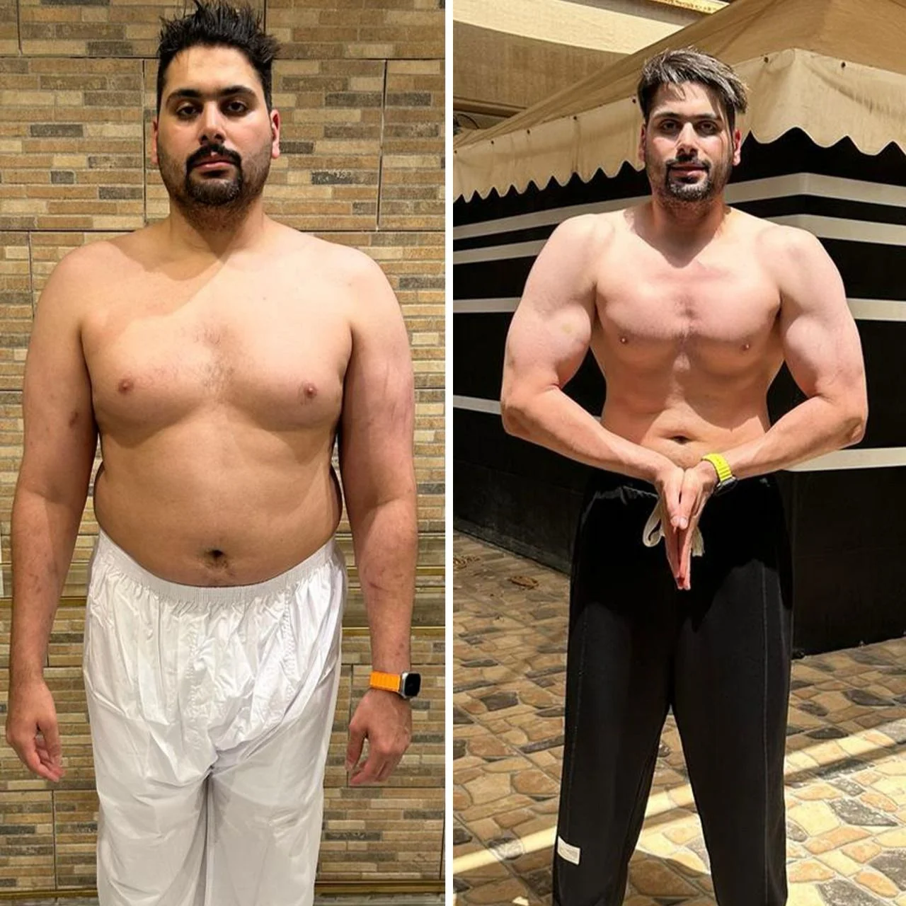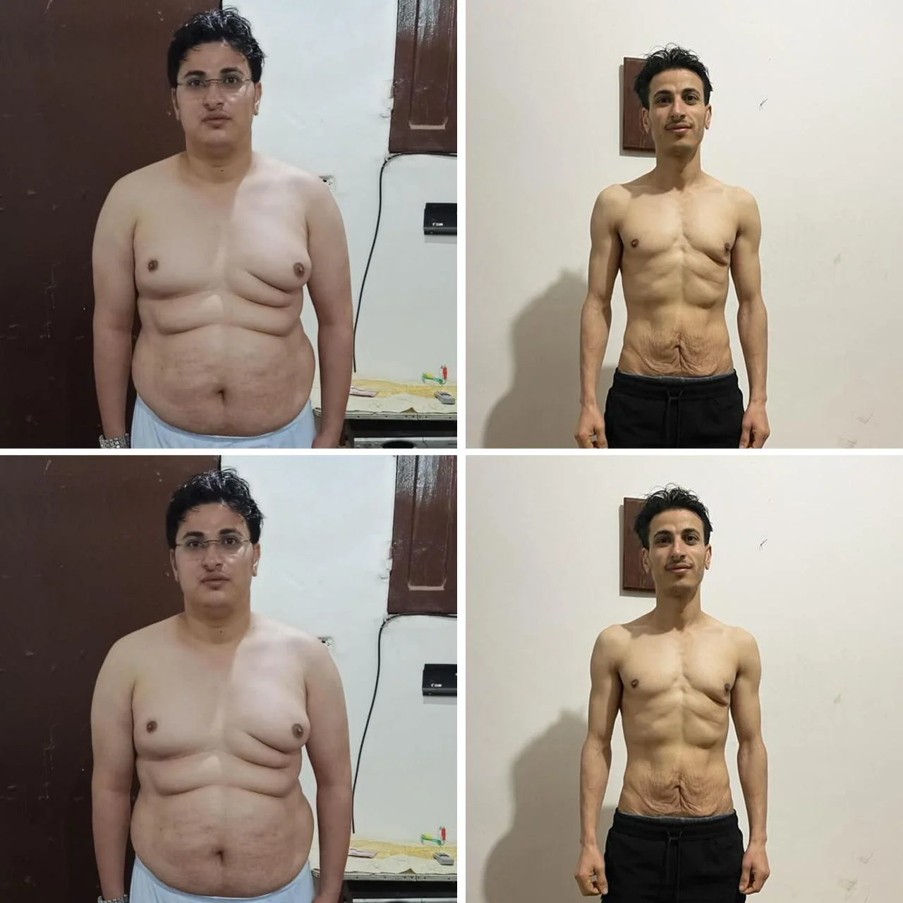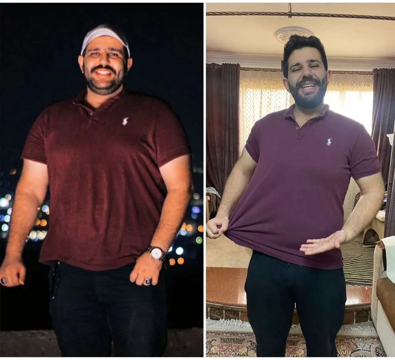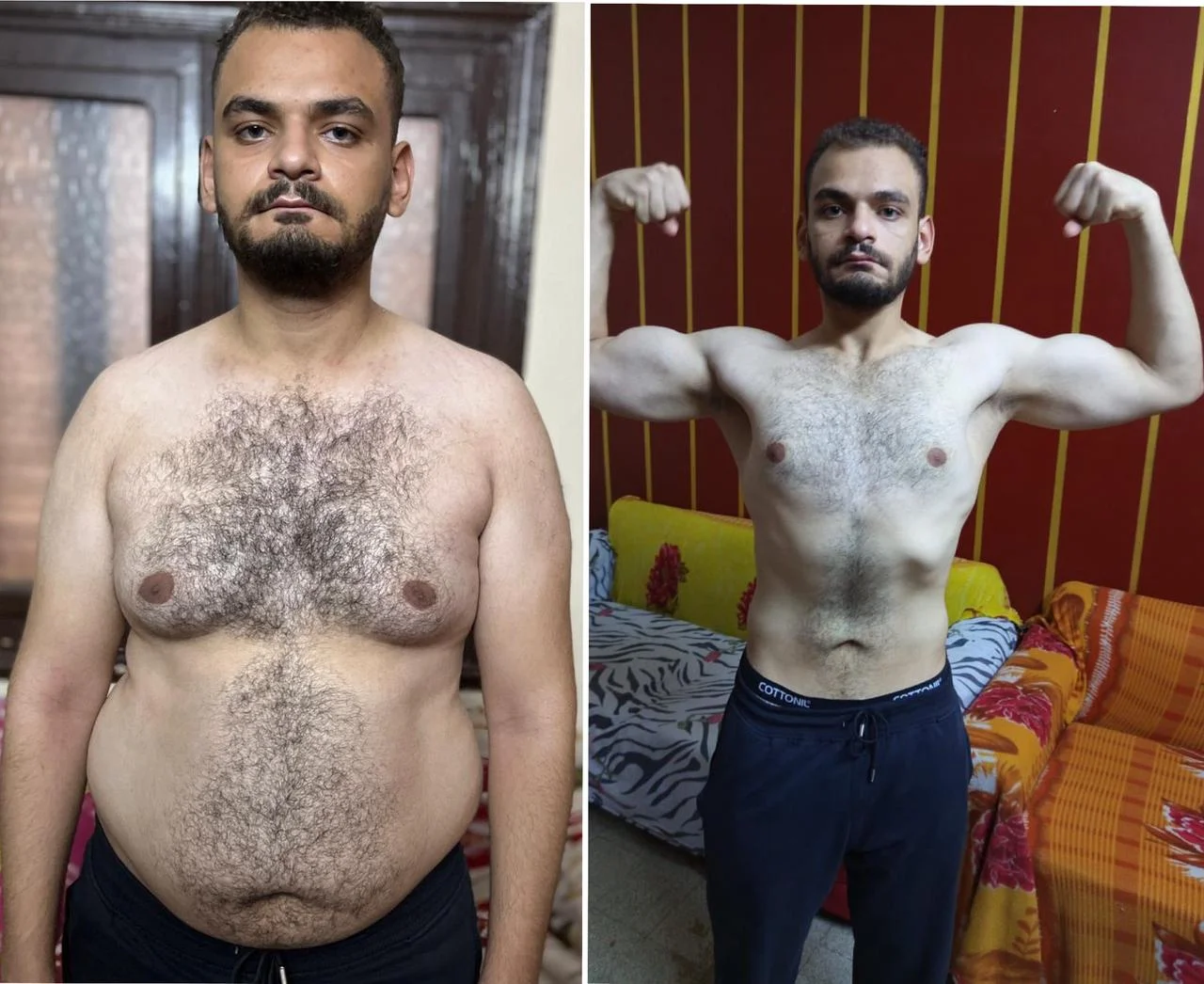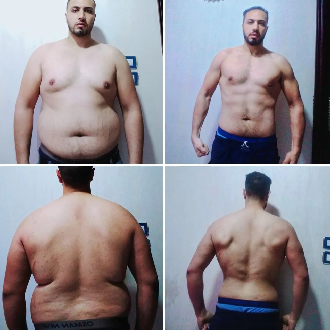 "احمد وزنة كان 112 كيلو مشكلتة كانت عدم الألتزام بالدايت واستمرار زيادة وزنة وهدفة كان الوصول لشكل رياضي بناء علي مشكلتة ووزنة وهدفة اشترك معايا في باقة بديل التكميم والنتيجة"